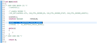I've integrated the Diagnostic Library source code into my current project, and I am only running the SL_SelfTest_CAN CAN_ECC_TEST_MODE_1BIT test on DCAN1 RAM. The issue I see is that when the 1Bit fault is created by reading from the corrupted data location, the fault that occurs is usually flagged with DEFLG instead of SEFLG in the DCAN1 ECC CS register (although sometimes it is correctly flagged with SEFLG). Pseudo-code from my startup procedure is below. Any guidance on how to correct this issue is greatly appreciated. Thanks!