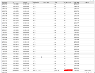 columns are RowNo, PC, OpCode, Function, Line No, File, Directory, Cycles, Status ("undefined instruction" is the last status). Interestingle the calls before this call don't make any sense because somehow some functions are already called that should be called later on but not before main.