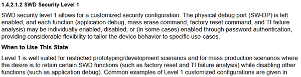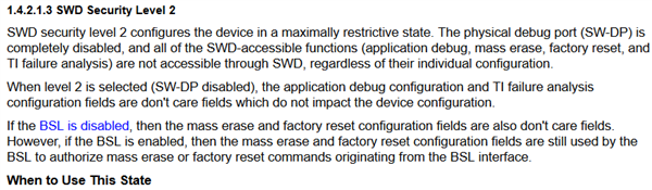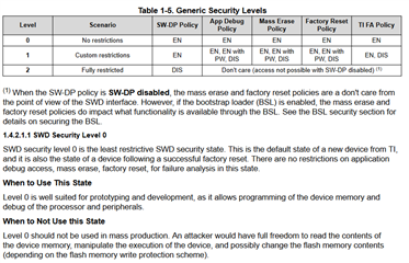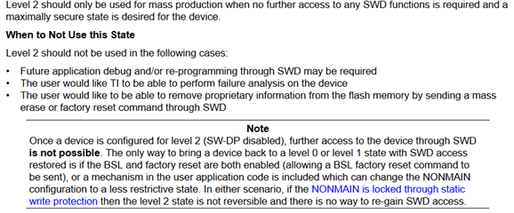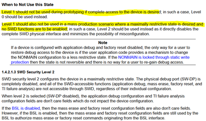 I know this looks like a lot, but it is important to understand. In summary, if you want to completely lock the device from any ability to access its memories, look at SWD Security Level 2 options. Else, if you want to leave a PW protected BSL access to factory reset the device (such as part of a OTA field update), then look at SWD Security level 1 options.