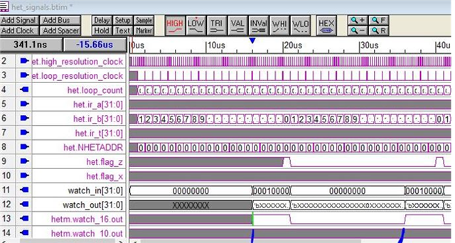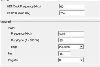 Please help me for writing a N2HET instruction to generate a pulse with width 4 micro seconds for every 20 microseconds period for TMS570lc4357 controller. (For every 20 microseconds, a trigger on the pin high to low should occur and after 4 microseconds, the same pin should become low). I tried with the below code, but it is not generating the pulse for every 20 microseconds. The pulse is shifting from 20, 42. 65..., (the LRP is 1 microsecond and HRP is around 266.7ns)