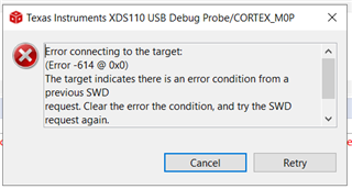 [4/2/2024, 11:19:24 AM] [ERROR] CORTEX_M0P: Error connecting to the target: (Error -614 @ 0x0) The target indicates there is an error condition from a previous SWD request. Clear the error the condition, and try the SWD request again. (Emulation package 9.13.0.00201