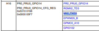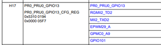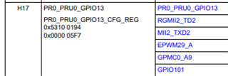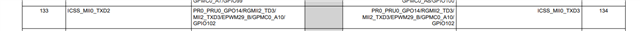 I was looking through the pinout for the HSEC-180 connector and I noticed that pins 133 and 134 have different signals names but the exact same muxed options (screenshot below). Looking closer, pin 133's signal name doesn't have a match in its muxed options, so I'm wondering if that's a mistake and the muxed signal name should instead be: "PR0_PRU0_GPO13/RGMII2_TD2/ MII2_TXD2/EPWM29_A/GPMC0_A9/GPIO101"