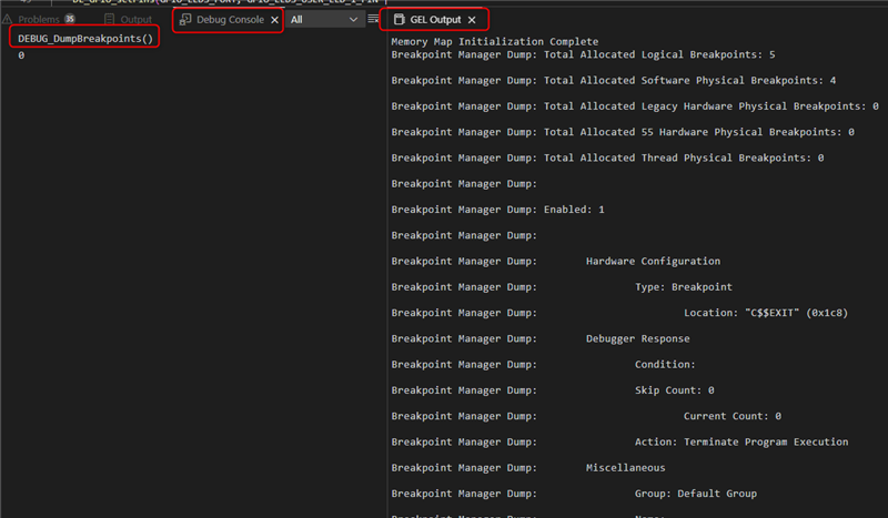 And check the GEL_Output view, check the output to see the status of breakpoint usage: