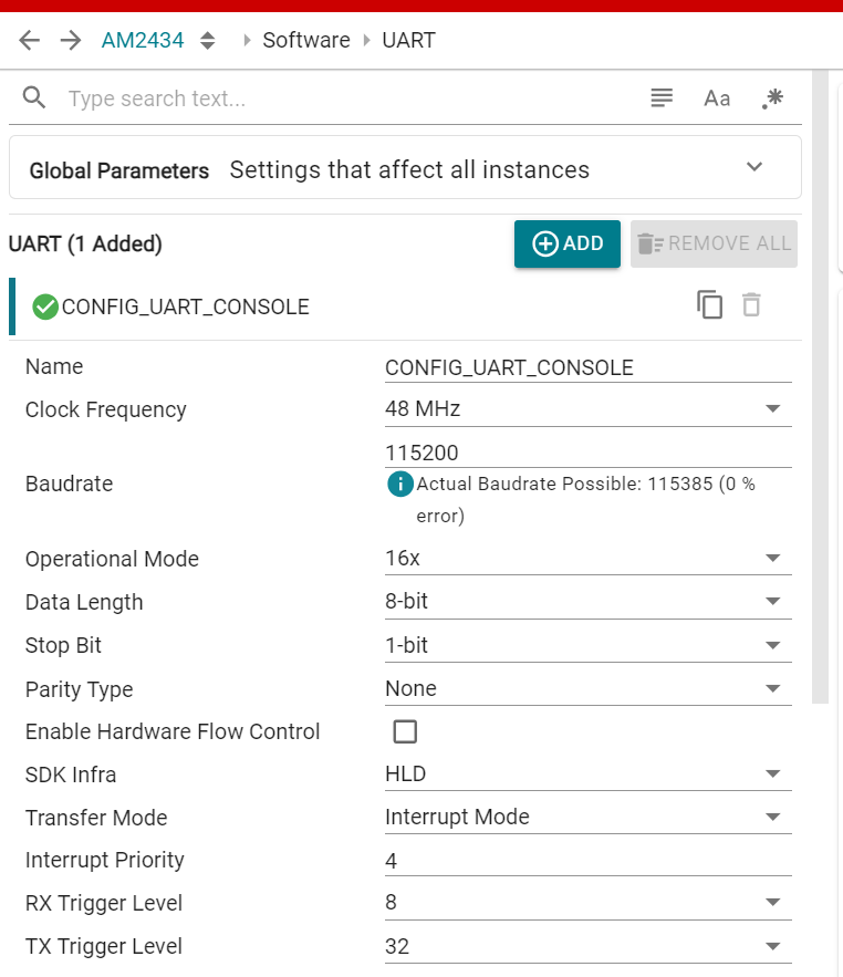 I am using uart_echo_am243x-lp_r5fss0-0_nortos_ti-arm-clang example code. I am unable to assign other uart pins apart from uart0_RX/TX. Help me resolve this