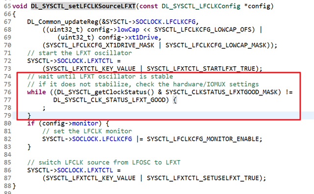 For example, in SDK sysctl_lfxt_standby example, if you import and build the project, you could see below code in DL_SYSCTL_setLFCLKSourceLFXT() API. The LFXT status is monitored after LFXT get enabled. After LFXT get stable, the LFXTGOOD bit is set and program will move forward. You could use similar code to check crystal status.