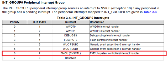 The SYSCTL interrupt is belong to INT_GROUP0. You could refer nvic_interrupt_grouping example in SDK to see how to handle GROUP interrupt.