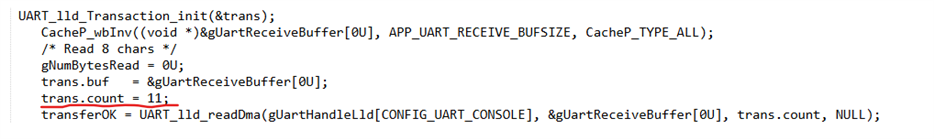 We are using UART DMA to transmit and receive data between the TI AM263Px and a modem, based on the example code: uart_echo_dma_lld_am263px-cc_r5fss0-0_nortos_ti-arm-clang.