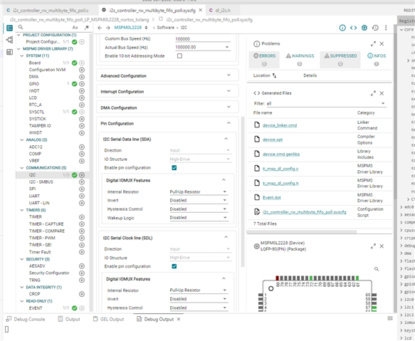 I am trying to use the config file to add the internal resistors. This is my first simple task, but it does not work. Do I have to save the syscfg file? I just did rebuild all. I used my oscilloscope to measure the I2C pin PA10/PA11, still low. I am using the LP-MSPM0L2228 launch pad. Thank you very much and look forward to getting some help.