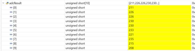 The theoretical value for a 12-bit ADC with 2.5 V reference is approximately 224 counts. The MSP430 result is close to expectation, but the MSPM0G3507 result is noticeably lower.