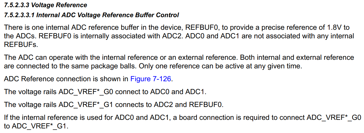 You will need to connect ADC_VREF*_G0 and ADC_VREF*_G1 to use internal reference for ADC0/1.