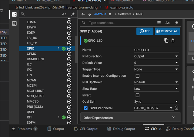 Unclear LED GPIO Setup: I am also unsure how to correctly configure the GPIO for the LaunchPad's user LED in SysConfig. Should I use the "LED" component under "TI BOARD DRIVERS" or configure a GPIO pin directly?