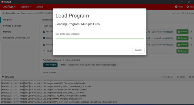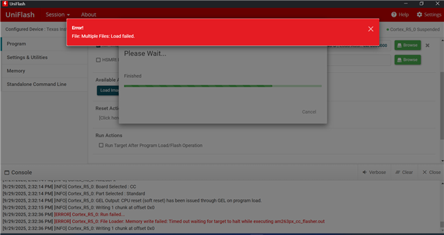 Time being im using AM263px CC dev board and micro usb cable on board debugger to flash. I tried flashing the bin file using uniflash tool by keeping boot DIP switches in xSPI boot mode but it throwed error.