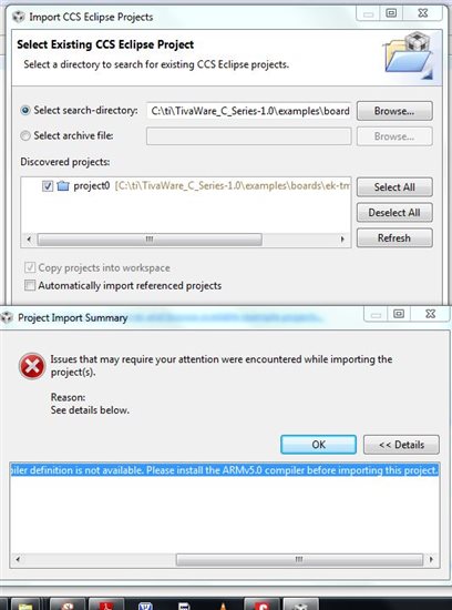 This week, at a TI tech day, I spoke with someone regarding the tivaware package, and they recommended that I install it, and use it to work with my new parts so I don't have to go back later and change things. So I downloaded Tivaware, and installed it. When trying to import the projects, I was getting errors regarding the ARMv5 compiler (sorry, it was a day ago, and I didn't write it down). I then checked code composer for updates, and went from Ver 5.2->5.3, and installed the ARM update that was listed. Now, I am able to import the Tivaware project, but am getting errors.