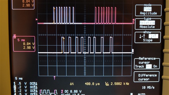 8x HIGH Pulses, width is const 400us, the LOW Pulse width change between 0,8...1.5ms