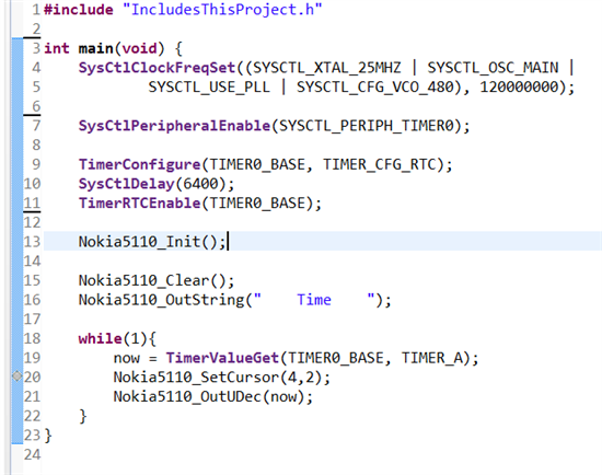 I trying to use the Real Time Clock to count in seconds on a Nokia 5110. This the code: (includes are in a different file)
