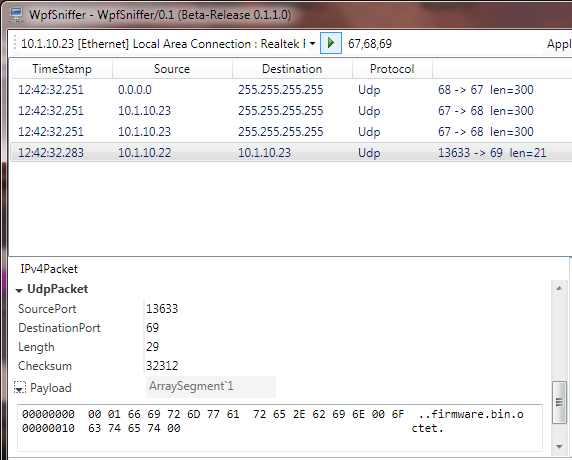 Packet Sniffer trace shows what appears to be a file name header sent from the TFTP client back to the server.