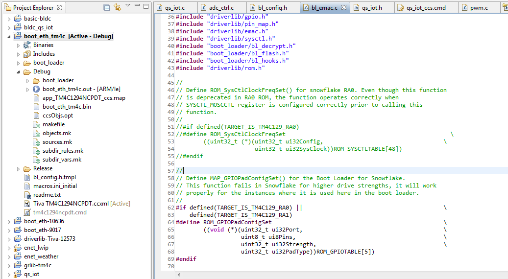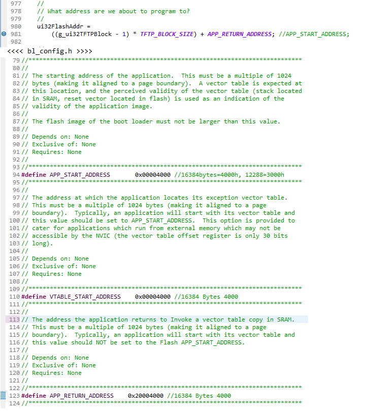 Debug: Shown top is (bl_emac.c) and the addition of an (Application Return Address). Found the TFTP data transfer & Flash loads into SRAM avoids writing flash memory corrupting the Application and Boot loader.