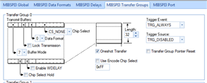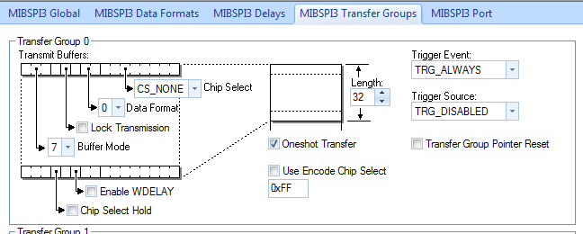 mibspiEnableLoopback(mibspiREG3, Analog_Lbk); dmaReqAssign(0,15); g_dmaCTRLPKT.SADD = (uint32)&txData; /* source address */ g_dmaCTRLPKT.DADD = (uint32)(&(mibspiRAM3->tx[0].data)); /* destination address */ g_dmaCTRLPKT.CHCTRL = 0; /* channel control */ g_dmaCTRLPKT.FRCNT = 1; /* frame count */ g_dmaCTRLPKT.ELCNT = dsize; /* element count */ g_dmaCTRLPKT.ELDOFFSET = 4; /* element destination offset */ g_dmaCTRLPKT.ELSOFFSET = 0; /* element source offset */ g_dmaCTRLPKT.FRDOFFSET = 0; /* frame destination offset */ g_dmaCTRLPKT.FRSOFFSET = 0; /* frame source offset */ g_dmaCTRLPKT.PORTASGN = 4; /* port b */ g_dmaCTRLPKT.RDSIZE = ACCESS_8_BIT; /* read size */ g_dmaCTRLPKT.WRSIZE = ACCESS_8_BIT; /* write size */ g_dmaCTRLPKT.TTYPE = FRAME_TRANSFER ; /* transfer type */ g_dmaCTRLPKT.ADDMODERD = ADDR_INC1; /* address mode read */ g_dmaCTRLPKT.ADDMODEWR = ADDR_OFFSET; /* address mode write */ g_dmaCTRLPKT.AUTOINIT = AUTOINIT_ON; /* autoinit */ /* - setting dma control packets */ dmaSetCtrlPacket(DMA_CH0,g_dmaCTRLPKT); /* - setting the dma channel to trigger on h/w request */ dmaSetChEnable(DMA_CH0, DMA_SW); dmaReqAssign(1,14); g_dmaCTRLPKT.SADD = (uint32)(&(mibspiRAM3->rx[0].data)); /* source address */ g_dmaCTRLPKT.DADD = (uint32)&rxData; /* destination address */ g_dmaCTRLPKT.CHCTRL = 0; /* channel control */ g_dmaCTRLPKT.FRCNT = 1; /* frame count */ g_dmaCTRLPKT.ELCNT = dsize; /* element count */ g_dmaCTRLPKT.ELDOFFSET = 0; /* element destination offset */ g_dmaCTRLPKT.ELSOFFSET = 4; /* element source offset */ g_dmaCTRLPKT.FRDOFFSET = 0; /* frame destination offset */ g_dmaCTRLPKT.FRSOFFSET = 0; /* frame source offset */ g_dmaCTRLPKT.PORTASGN = 4; /* port b */ g_dmaCTRLPKT.RDSIZE = ACCESS_8_BIT; /* read size */ g_dmaCTRLPKT.WRSIZE = ACCESS_8_BIT; /* write size */ g_dmaCTRLPKT.TTYPE = FRAME_TRANSFER ; /* transfer type */ g_dmaCTRLPKT.ADDMODERD = ADDR_OFFSET; /* address mode read */ g_dmaCTRLPKT.ADDMODEWR = ADDR_INC1; /* address mode write */ g_dmaCTRLPKT.AUTOINIT = AUTOINIT_ON; /* autoinit */ /* - setting dma control packets */ dmaSetCtrlPacket(DMA_CH1,g_dmaCTRLPKT); /* - setting the dma channel to trigger on h/w request */ dmaSetChEnable(DMA_CH1, DMA_SW); /* - configuring the mibspi dma , channel 0 , tx line -0 , rxline -1 */ /* - refer to the device data sheet dma request source for mibspi tx/rx */ mibspiDmaConfig(mibspiREG3,0,14,15); dmaEnableInterrupt(0, FTC); /* - enabling dma module */ dmaEnable(); /* - start the mibspi transfer tg 0 */ mibspiTransfer(mibspiREG3,0 ); /* ... wait until transfer complete */ while(!(mibspiIsTransferComplete(mibspiREG3,0))) { }; /* copy from mibspi ram to sys ram */ //----------------------------SD while(1); /* loop forever */