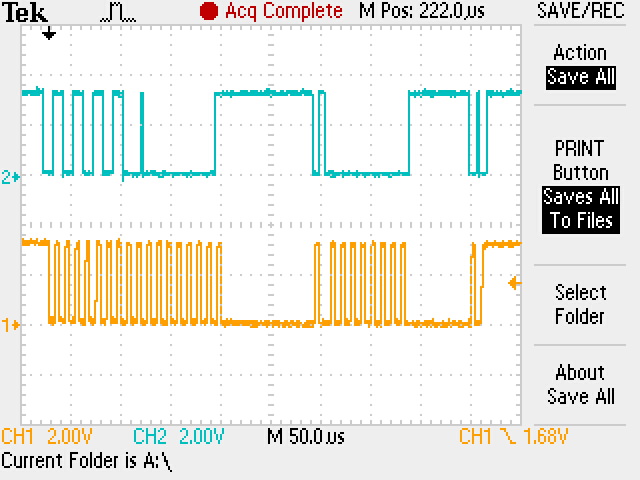 The scope shot below has SDA on the top and SCL on the bottom. As you can see, the address is transmitted correctly, but the first data byte that is transmitted is 0x01 (it should be 0x00). The second byte transmitted is 0x00, but it should be 0x01.