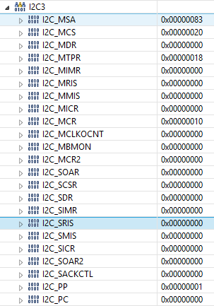I'm not sure how it's best to show how I configured the I2C3 ports, with code or with the Register maps. I'll go for both. Right before I run the highlighted line, this is how the settings for the I2C3 regs are: