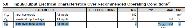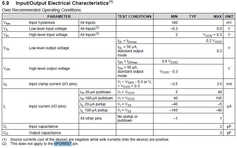 what is the min. specification for Vih for the nPORRST Pin or does the standard value of min. 2V applies here? While Chapter 6.2.3.1 lists the parameter for ViL for nPORRST, there is none for Vih. Note 2 implies that Vih will be different for nPORRST.
