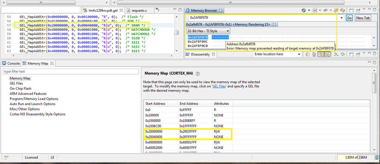 TM4c1294ncpdt Gel file shows the SRAM range as per memory map in datasheet. Notice the R/W attribute is NONE for the second part of SRAM range. Consequently this is the same precise memory location (0x2AFBF079) that persistently coincides with random bus fault 11 status. Have changed the project compiler to 5.14 and set optimization in the middle to see if that helps. Also getting same Memory Browser error if the target is running or paused.