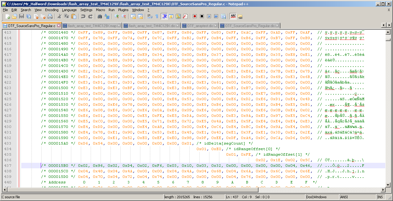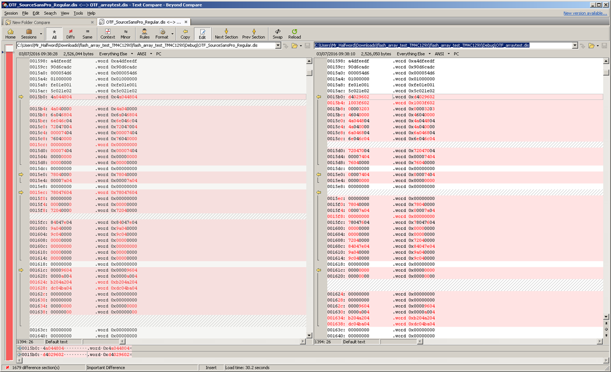 I'm trying to flash a huge array (280kB) to my TM4C129X (it's a font file) and I do array operations on it to parse the file and get its goodies and I've noticed that the array isn't loading properly into the chip's flash at least as far as the JTAG and program on board see it. I've verified that this exact code works on my RM48L952 (big difference in processor, I know) but when I read the flash out from the TM4C it ends up misaligned. The data at offset address 0x4454 in is 16B ahead of where it should be and by the time you get to the final address, offset 0x0003 95CF, the data stopped 0x190 before it should have.