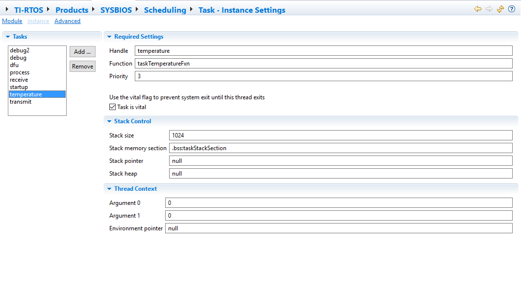uint8_t GPTMCTL_disable= 0x00; uint8_t GPTMCTL_enable = TIMER_CTL_TAEN; uint32_t GPTM_ILR= TIMER_DMA_LOAD_PEROID; // Temporary storage for the first uDMA primary task, for scatter-gather looping static tDMAControlTable uDMAsg_LoopTask; static tDMAControlTable uDMAsg_TaskList[] = { // // Task 2: copy source buffer to timer interval load // uDMATaskStructEntry(1, UDMA_SIZE_32, UDMA_SRC_INC_NONE, &GPTM_ILR, UDMA_DST_INC_NONE, (void*)(TIMER5_BASE + TIMER_O_TAILR), UDMA_ARB_1, UDMA_MODE_PER_SCATTER_GATHER ), // // Task 4: loop // uDMATaskStructEntry( 4, UDMA_SIZE_32, UDMA_SRC_INC_32, &uDMAsg_LoopTask, UDMA_DST_INC_32, &(B134_332_DMAControlTable[UDMA_CH14_GPIOE & 0x1f]), UDMA_ARB_4, UDMA_MODE_MEM_SCATTER_GATHER ) }; void initMLSFallingEdgeDetection(){ // initialize interrupt uDMAChannelDisable(UDMA_CH14_GPIOE & 0xffff); // Ensure channel is disabled before modifying register uDMAChannelAssign(UDMA_CH14_GPIOE); uDMAChannelAttributeDisable((UDMA_CH14_GPIOE & 0xffff)|UDMA_PRI_SELECT,UDMA_ATTR_ALL); uDMAChannelAttributeDisable((UDMA_CH14_GPIOE & 0xffff)|UDMA_ALT_SELECT,UDMA_ATTR_ALL); uDMAChannelAttributeEnable((UDMA_CH14_GPIOE & 0xffff)|UDMA_PRI_SELECT,UDMA_ATTR_USEBURST); uDMAChannelAttributeEnable((UDMA_CH14_GPIOE & 0xffff)|UDMA_ALT_SELECT,UDMA_ATTR_USEBURST); uDMAChannelScatterGatherSet(UDMA_CH14_GPIOE & 0xffff, 2, uDMAsg_TaskList, true); // Copy the primary control structure from the uDMA controltable uDMAsg_LoopTask.pvDstEndAddr = B134_332_DMAControlTable[UDMA_CH14_GPIOE & 0xffff].pvDstEndAddr; uDMAsg_LoopTask.pvSrcEndAddr = B134_332_DMAControlTable[UDMA_CH14_GPIOE & 0xffff].pvSrcEndAddr; uDMAsg_LoopTask.ui32Control = B134_332_DMAControlTable[UDMA_CH14_GPIOE & 0xffff].ui32Control; uDMAsg_LoopTask.ui32Spare = B134_332_DMAControlTable[UDMA_CH14_GPIOE & 0xffff].ui32Spare; Timer_setPeriod(g_mlsTimer, TIMER_LOAD_PERIOD); }
