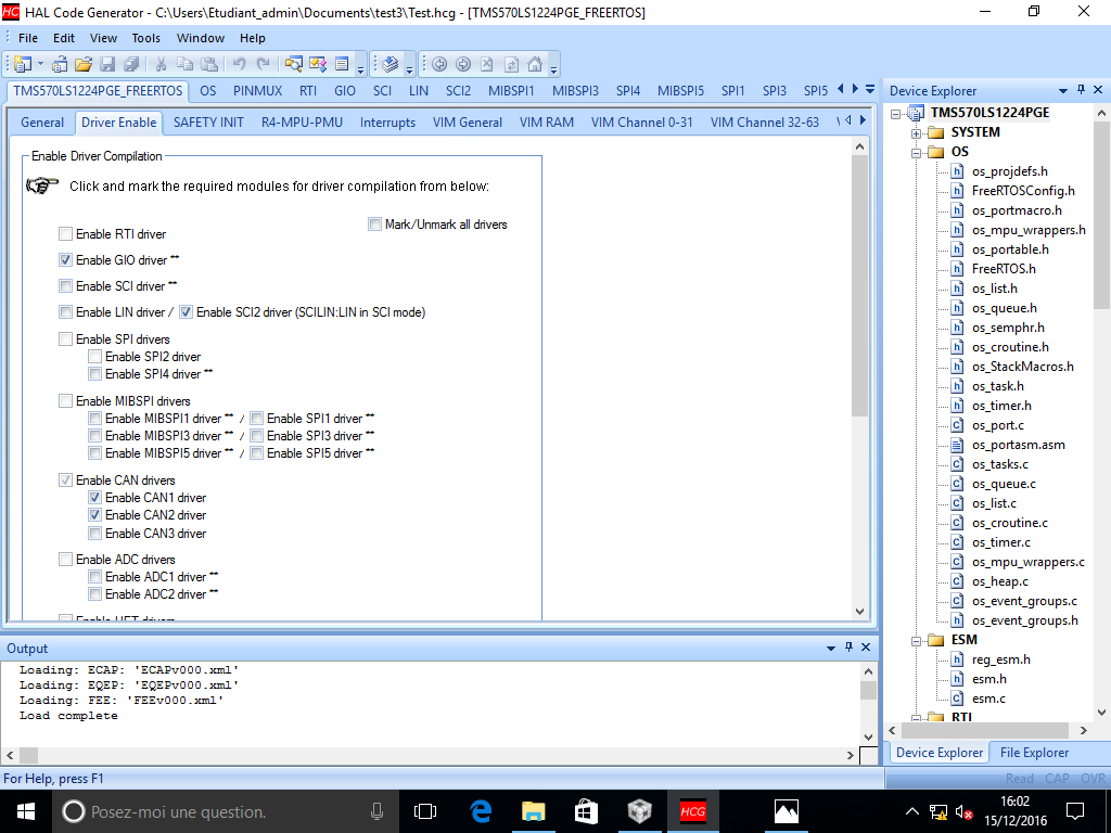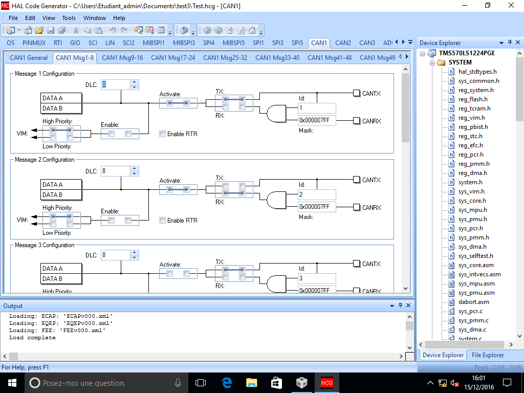 I am learning how to use the CAN of the TMS570 LS 12,I try to send a message from CAN1 to CAN 2 however, I can not get the message (the program is locked at: while(!canIsRxMessageArrived(canREG1,canMESSAGE_BOX2)); ) and I can not figure out why it does not work.