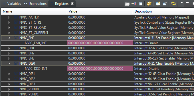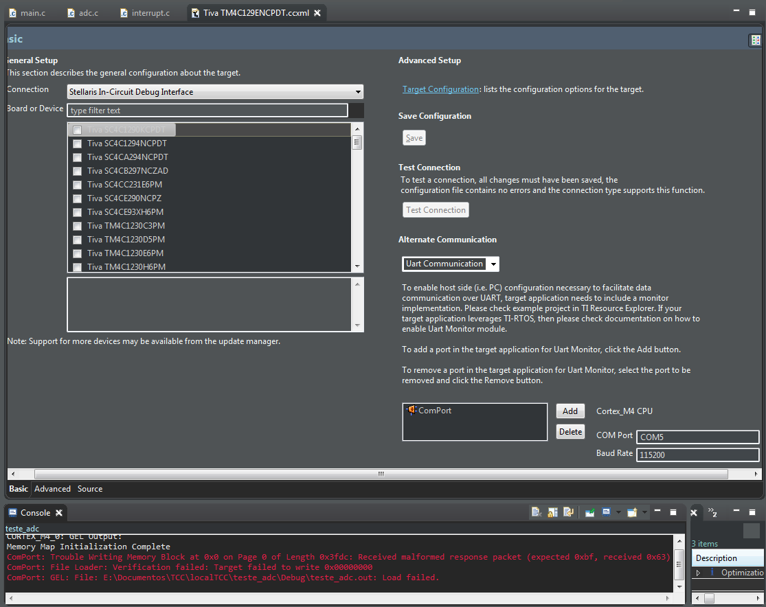However, it is not working properly. Sometimes the interrupt happens, it reaches a breakpoint i've set inside the ISR, and the conversion reading is ok, plus it keeps working until I close CCS or reboot my PC. But most of the times it doesn't work, the program stays on the infinite loop waiting for the interrupt and it never occurs. I've already looked on the register map and everything seems to be ok on the NVIC and on the Timer Regs.