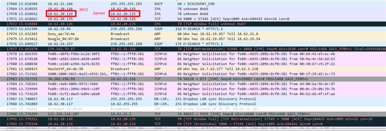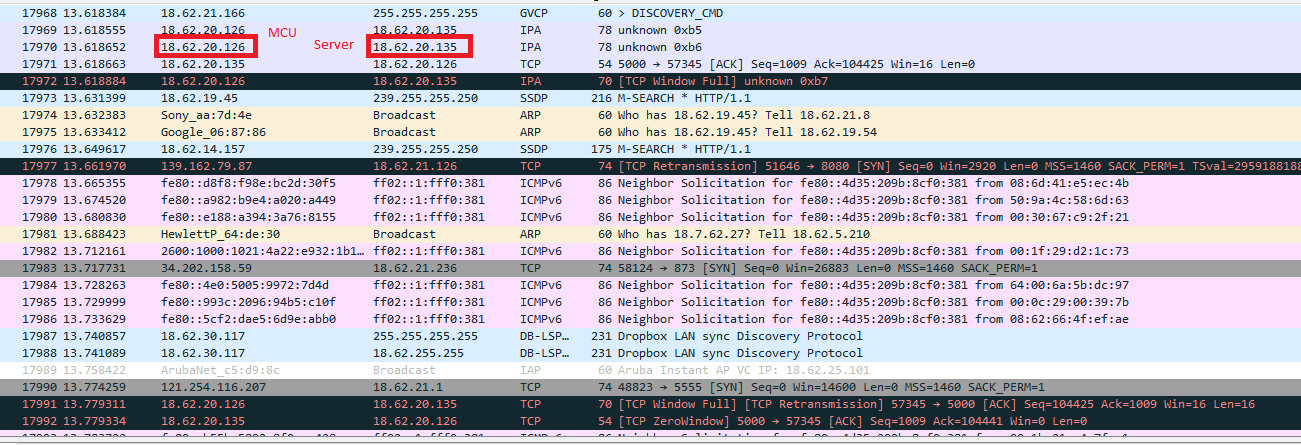 I am trying to add Ethernet communication to my existing project. I use TCP IP stack in TI-RTOS. When my MCU is configured as a server and my remote device is a client communication works fine. I stream 24 bytes approximately at 3kHz rate. I am trying to implement the opposite case with MCU acting as a client. I am able to establish connection, however after couple of seconds transmission stops. I have used Wireshark to look at the transmission communicates. I always get TCP WINDOW FULL, TCP RETRANSMISSION a couple of times and finally it ends with TCP ZERO COMMUNICATE. TCP client (MCU) stops transmission, even though the send() command is in tcpHandler() task while(1) loop and semaphore or ctr1 variable (depending how I release the loop()) are being set by the interrupt. I used loging info to check that.
