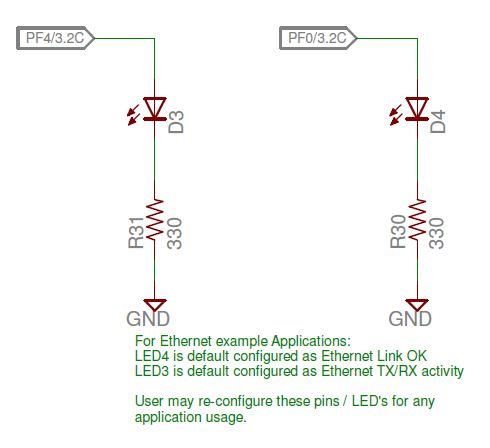 PF4/EN0LED1 and PF4/EN0LED1 ports are used to connect the Ethernet LEDs.