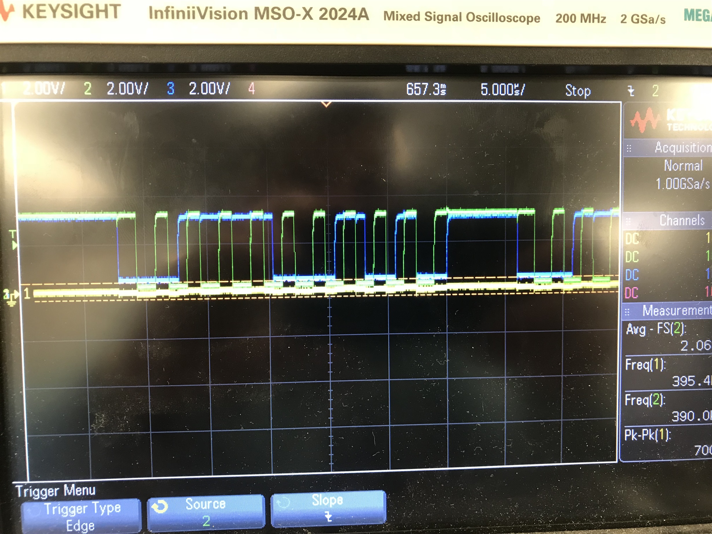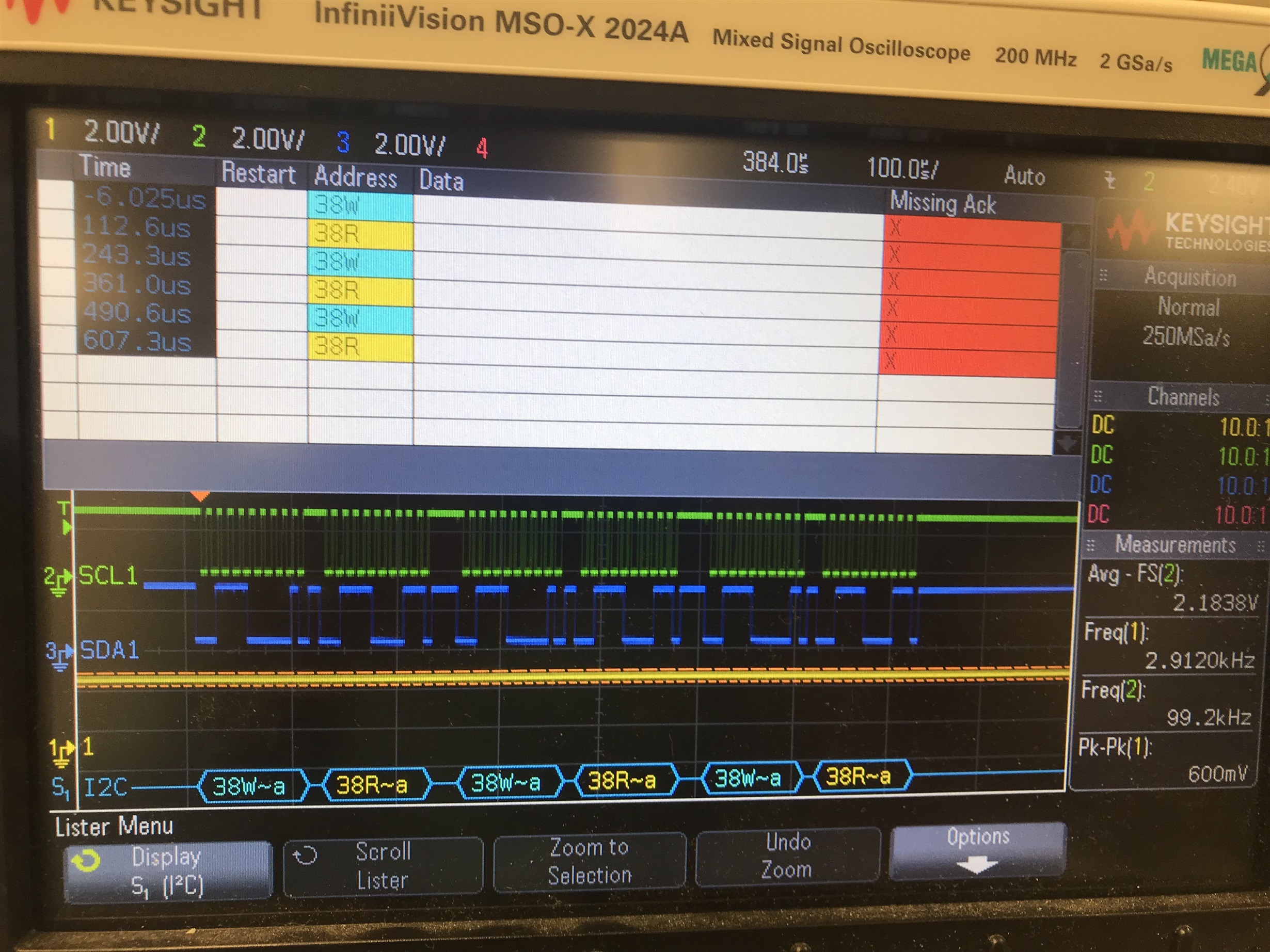 I've probed the SDA and SCL lines and observe the following manner when I begin my transmission and attempt to write to register 0x38. I've looked through the TI document at and am still unable to understand why I am not receiving any communication with the touch controller.