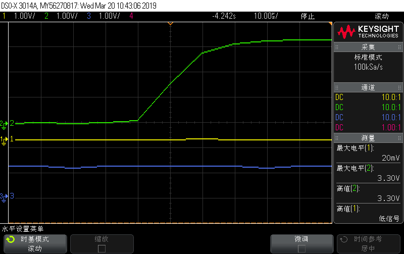 The reset signal on the pin is like line 2, it takes 26us from 0 to 3.0v: