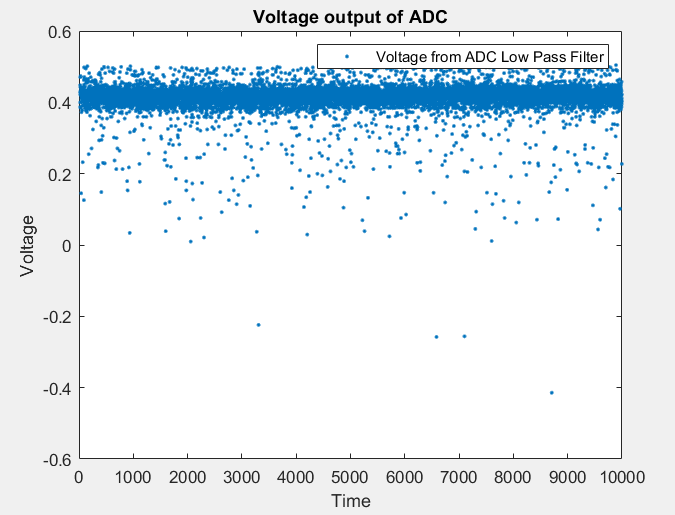 A value of 0.384 should approximately return 2260, which there is an unmistakable dark line to show consistency, but then there is a lot of extra points above this. At an adc_val of 2350, this is roughly 150 mV above the value, but while watching the oscilloscope, there was never any noise near this range.