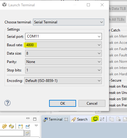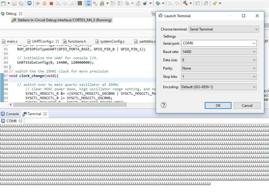 // uart0 configuration -> pc serial void ConfigureUARTSerial(void) { // uint32_t g_ui32SysClock = MAP_SysCtlClockFreqSet((SYSCTL_XTAL_25MHZ | // SYSCTL_OSC_MAIN | SYSCTL_USE_PLL | // SYSCTL_CFG_VCO_480), 120000000); // Enable the GPIO Peripheral used by the UART. ROM_SysCtlPeripheralEnable(SYSCTL_PERIPH_GPIOA); // Enable UART0 ROM_SysCtlPeripheralEnable(SYSCTL_PERIPH_UART0); // Configure GPIO Pins for UART mode. ROM_GPIOPinConfigure(GPIO_PA0_U0RX); ROM_GPIOPinConfigure(GPIO_PA1_U0TX); ROM_GPIOPinTypeUART(GPIO_PORTA_BASE, GPIO_PIN_0 | GPIO_PIN_1); // Initialize the UART for console I/O. UARTStdioConfig(0, 4800, 120000000); }