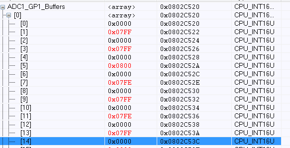 setting adc1_dmaCTRLPKT.WRSIZE to ACCESS_16_BIT doesn't really work, the buffer looks like this then:
