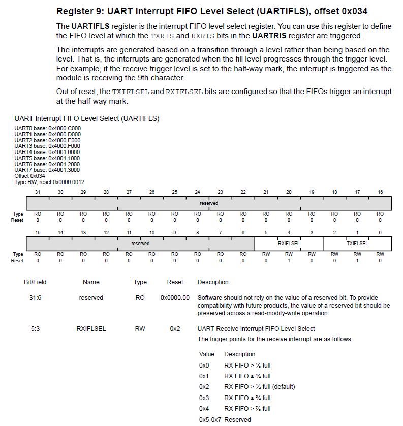 "The trigger points at which the FIFOs generate interrupts is controlled via the UART Interrupt FIFO LevelSelect (UARTIFLS) register (see page 922). Both FIFOs can be individually configured to trigger interrupts at different levels. Available configurations include ⅛, ¼, ½, ¾, and ⅞."
