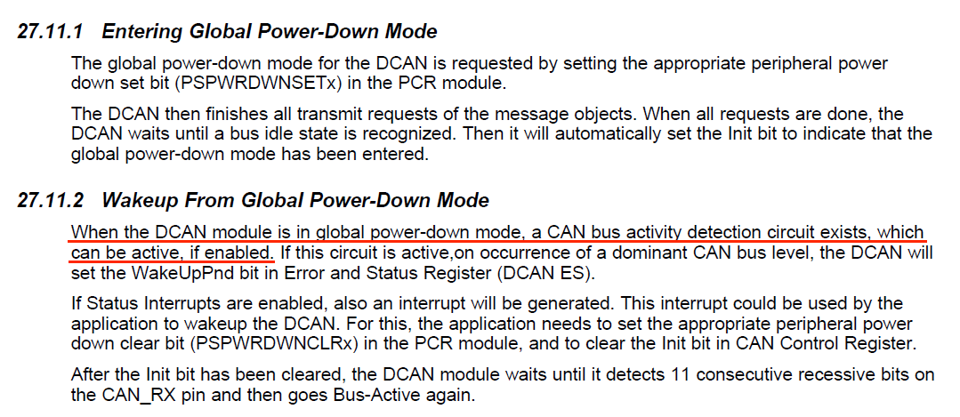 In this approach, When I send CAN message (from second MCU) during Low Power Mode it immediately wake up and switch to normal operation. I do not know why because WAKEMASKSET0 is not configure for that.