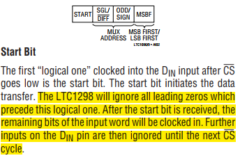 - According to the datasheet, the LTC1298 requires the following input data to start the conversion: