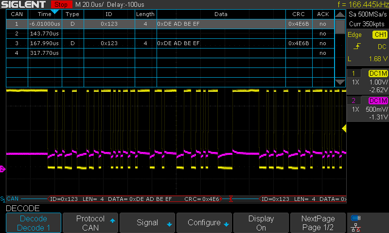 I currently have the launchpad connected to a WaveShare CAN device stuck in a breadboard. It seems to have a 120 ohm resistor on it and the other 120ohm resistor is on the other side of the cable. The other end of the cable is plugged into a PEAK USB to CAN adapter. Both sides are setup at 500k and I use the cansend command on my PC to send 123#DEADBEEF. However upon hearing this the TM4C begins repeating as fast as it can: "CAN interrupt 0x8000 0x65" I think indicating that there was a Bit 0 error.