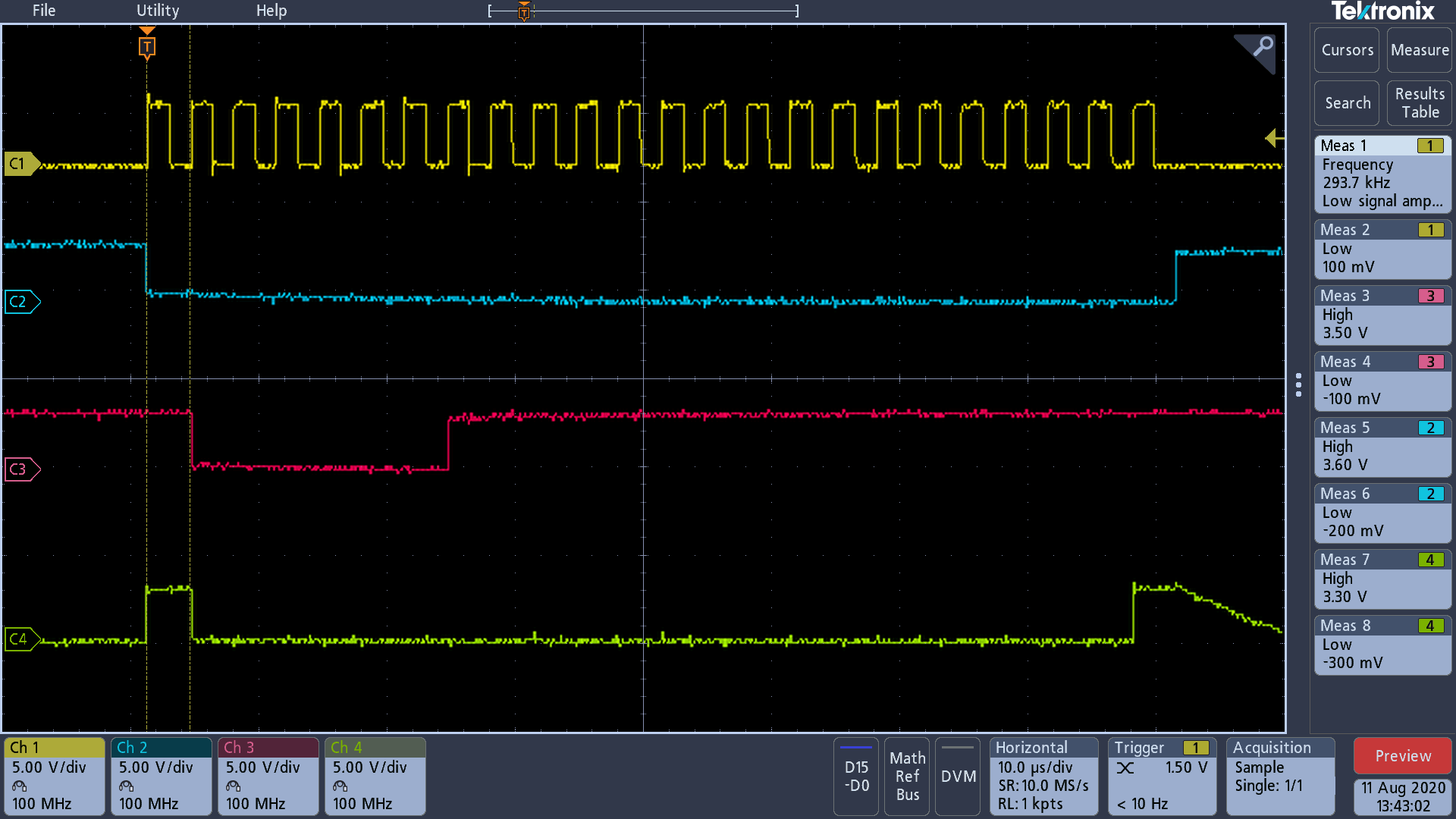 Below is the read access cycle and write access cycle images from scope. Probe1=CLK, Probe2=CS, Probe3=MOSI, Probe4=MISO