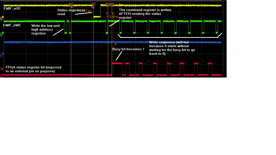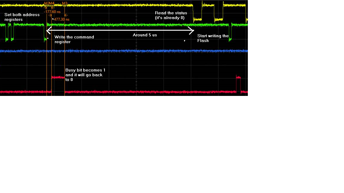 Nevertheless, I've noticed that, no matter what, there's no way I could see the "busy" state of the status register and every time the FPGA looked like idle, so that I proceed with the Flash programming but it unavoidably fails. So I tried to look at the busy bit transitions with the oscilloscope and I found the following: