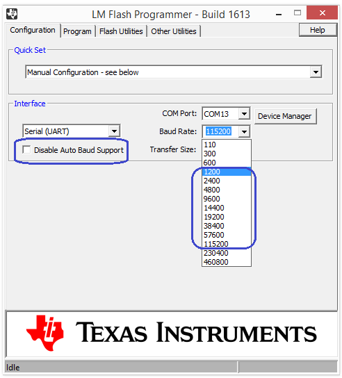 After that if the device is programmed using LM Flash (by disabling the Auto Baud Support), the programming is successful.