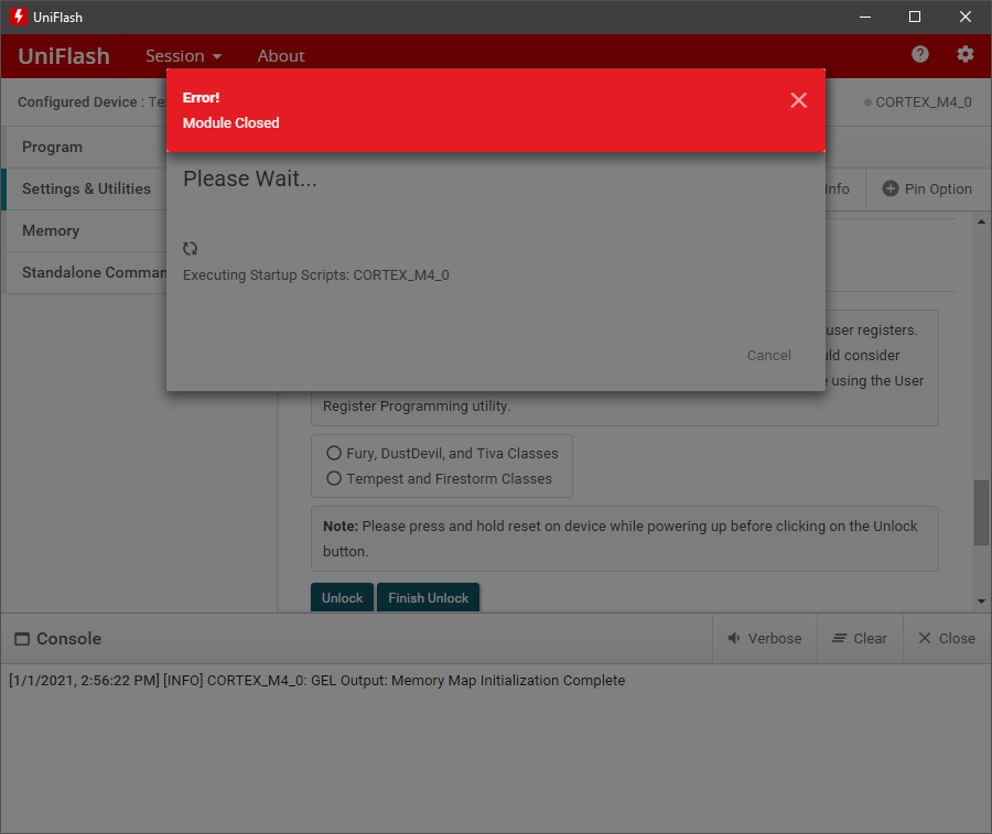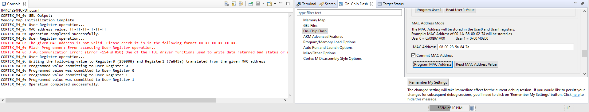 I am attempting to program a custom board using a TM4C1294NCPDT microcontroller and a XDS 100V2 debugger. I was previously able to program the microcontroller via CCS successfully. The debugger was working correctly and the program halted at , however I needed to flash a mac address into user memory. After attempting to flash a mac address using UniFlash CCS will no longer program the MCU. I am getting the following error message,
