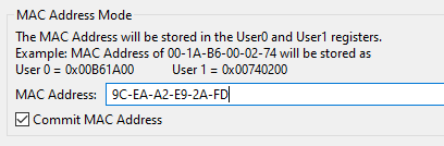 I programmed in the following mac address using UniFlash, 9C-EA-A2-E9-2A-FD.