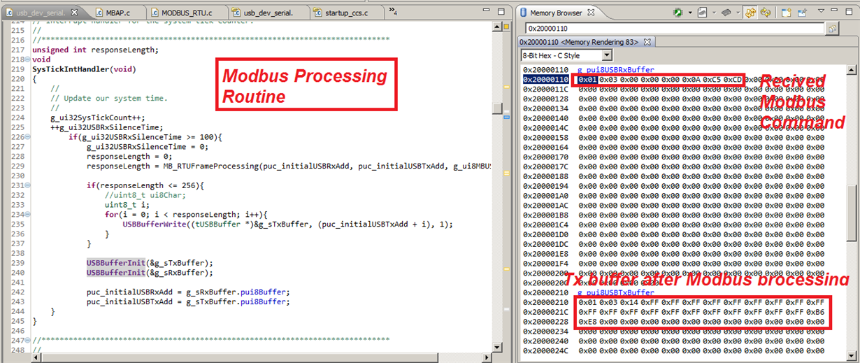 We have modified the example of usb_dev_serial to interface with host PC using Modbus, we are receiving modbus commands and processed it then update the USB Tx buffer, but there are no data get transmitted on the USB of board to host PC, is there any step we miss to ask the MCU to transmit the data?????