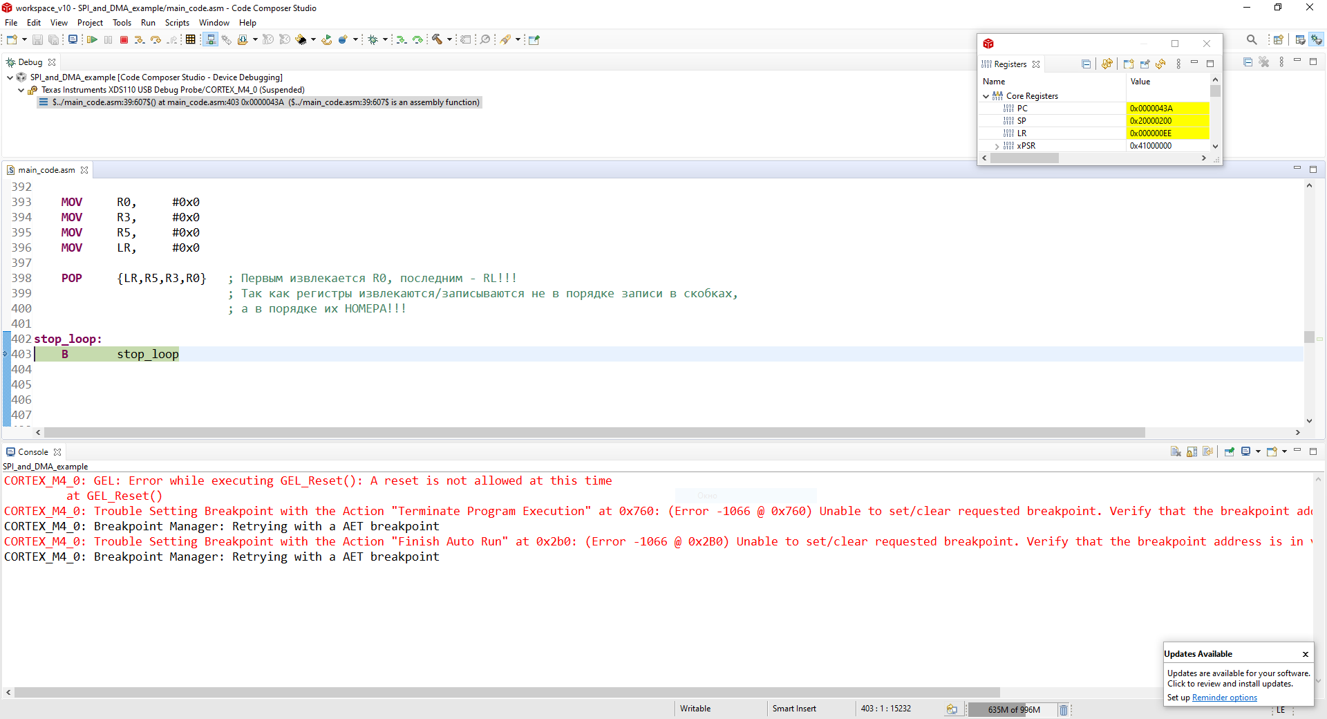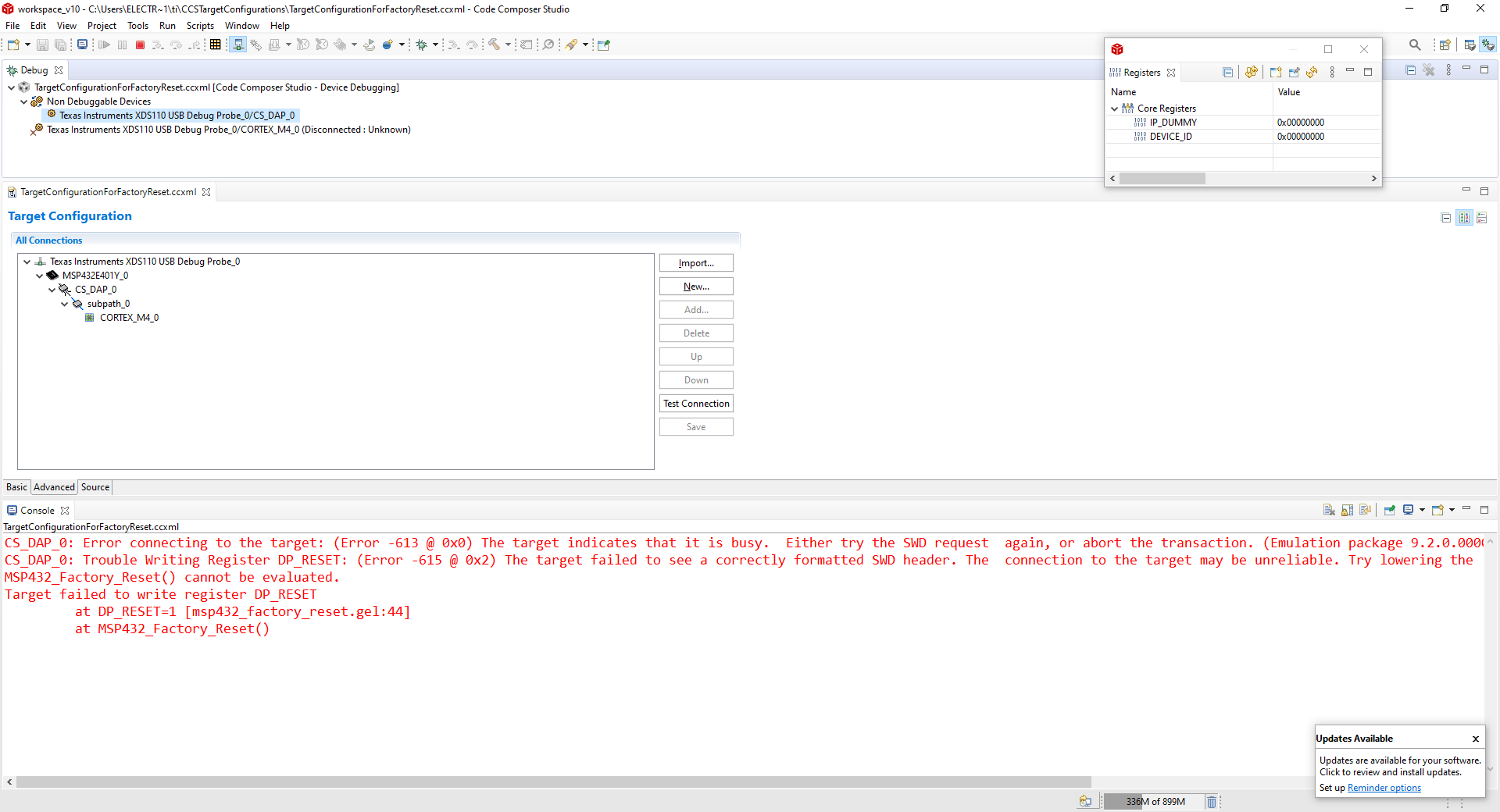 So, my microcontroller falls in reset again, again and again. The D-bugger lost the connection with microcontroller after step (2). And I can’t load new code into the device again and I can’t connect to it. When I start debugging, I see the error: