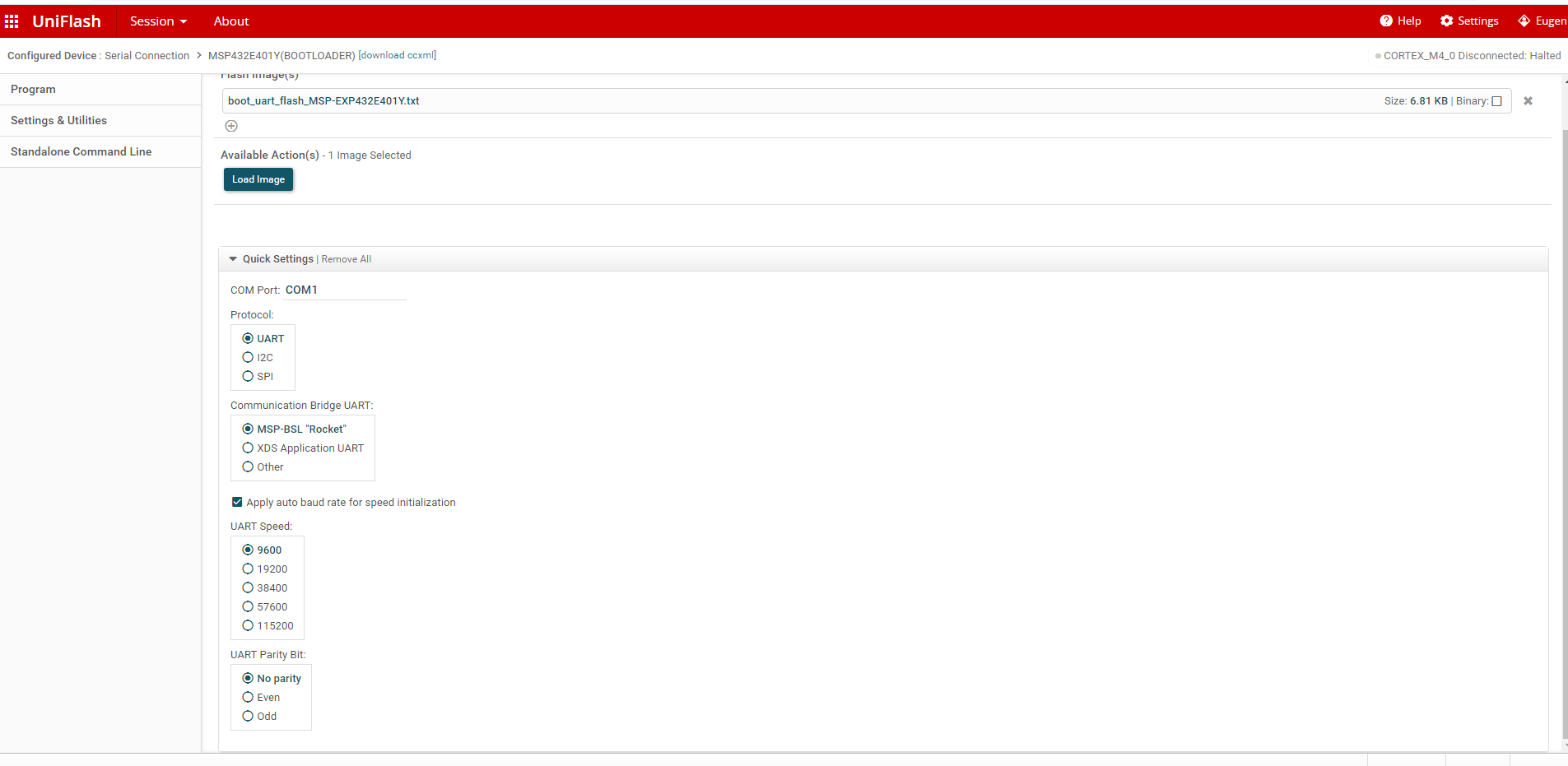 I have tried to load an image with UniFlash, but my device does not response (I tried to load holding the microcontroller in hardware reset or without the holding). With a scope I see the impulses coming from PC, but the microcontroller continue to be silent.