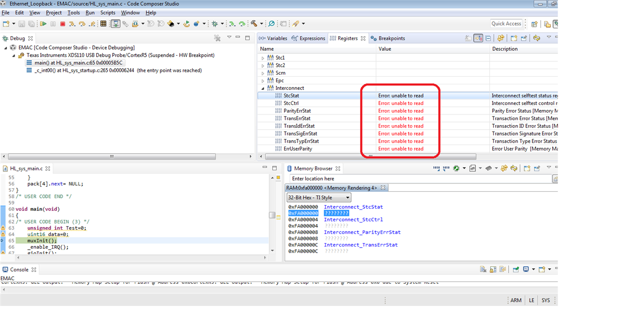 As per the attached screenshot, I am getting the error during the debug mode option. I am able to read the other registers.